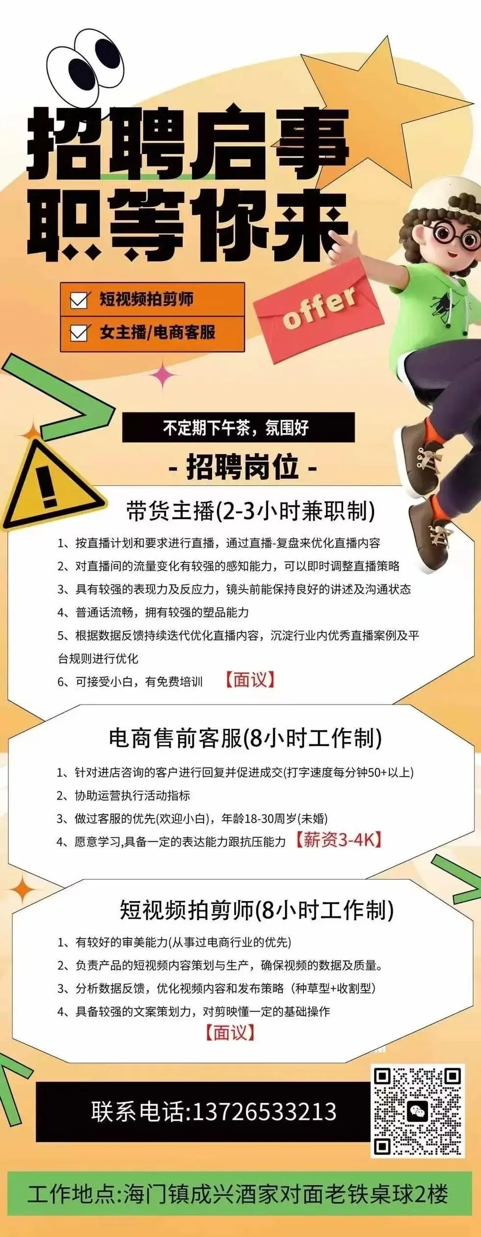 📣📣招聘、客服、短视频拍剪师 以及带货女主播多名~有工作经验者优先行业:电子商务有意者请联系☎13726533213