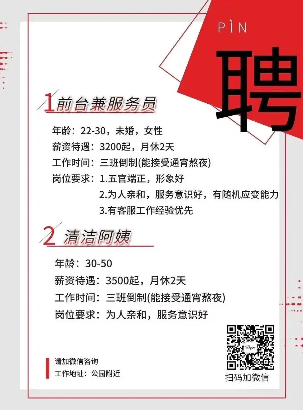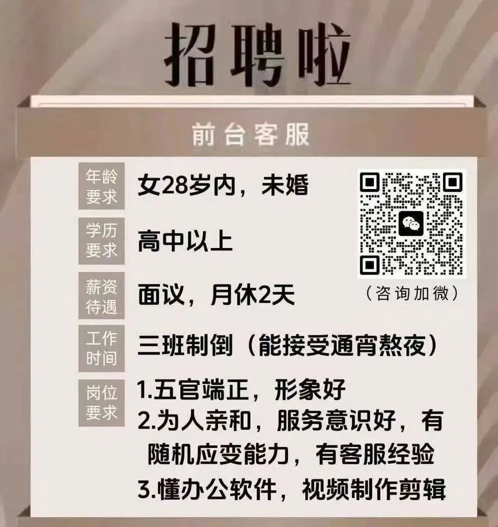 ‼️招聘‼️前台兼服务员和清洁阿姨工作地址:公园附近联系电话☎️:18029586688