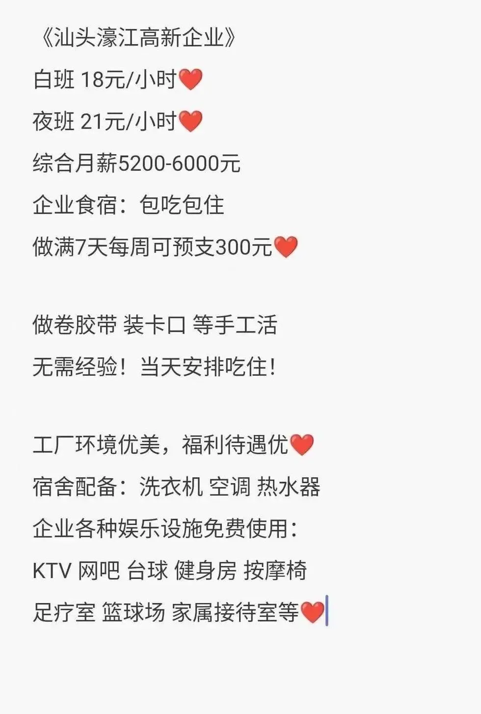 招聘[庆祝]招聘[庆祝]招聘[庆祝]🔥就在【海门交界处】🔥🎉 汕头濠江南站企业 🎉白班 18元/小时[爱心]夜班 21元/小时[爱心]综合月薪5200-6000元企业食宿:包吃包住做满7天每周可预支300元[玫瑰]做卷胶带 装卡口 等手工活无需经验!当天安排吃住!工厂环境优美,福利待遇优[强]宿舍配备:洗衣机 空调 热水器企业各种娱乐设施免费使用:KTV 网吧 台球 健身房 按摩椅足疗室 篮球场 家属接待室等[拥抱]