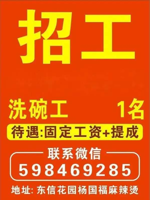 招女洗碗打杂工1名,要求:女,30岁至50岁,能吃苦耐劳,有责任心,待遇:固定工资加提成,工作地点:东信花园杨国福麻辣烫。联系微信598469285。