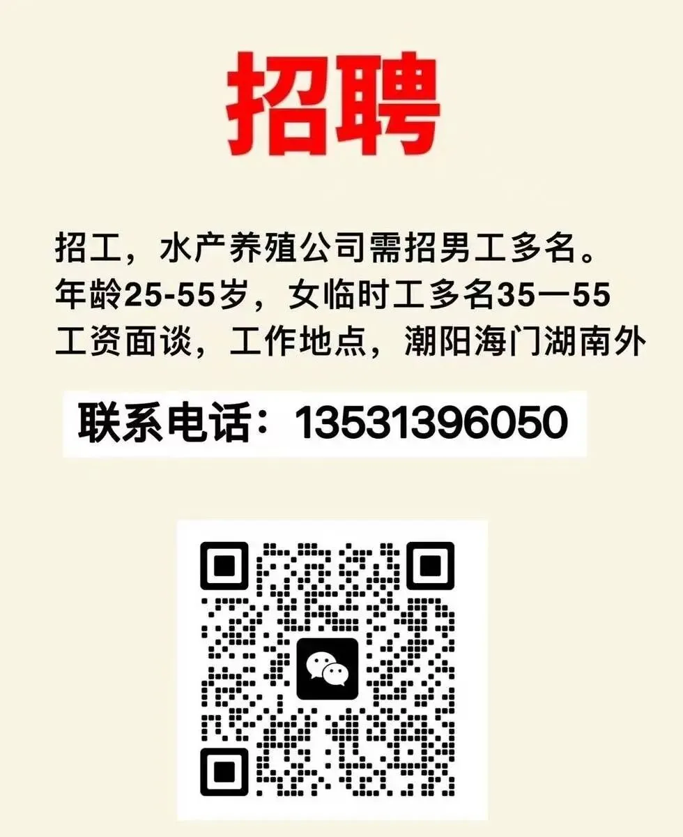 📣📣招工,水产养殖公司需招男工多名。年龄25-55岁,女临时工多名35一55,工资面谈,工作地点,潮阳海门湖南外,联系电话☎️:13531396050