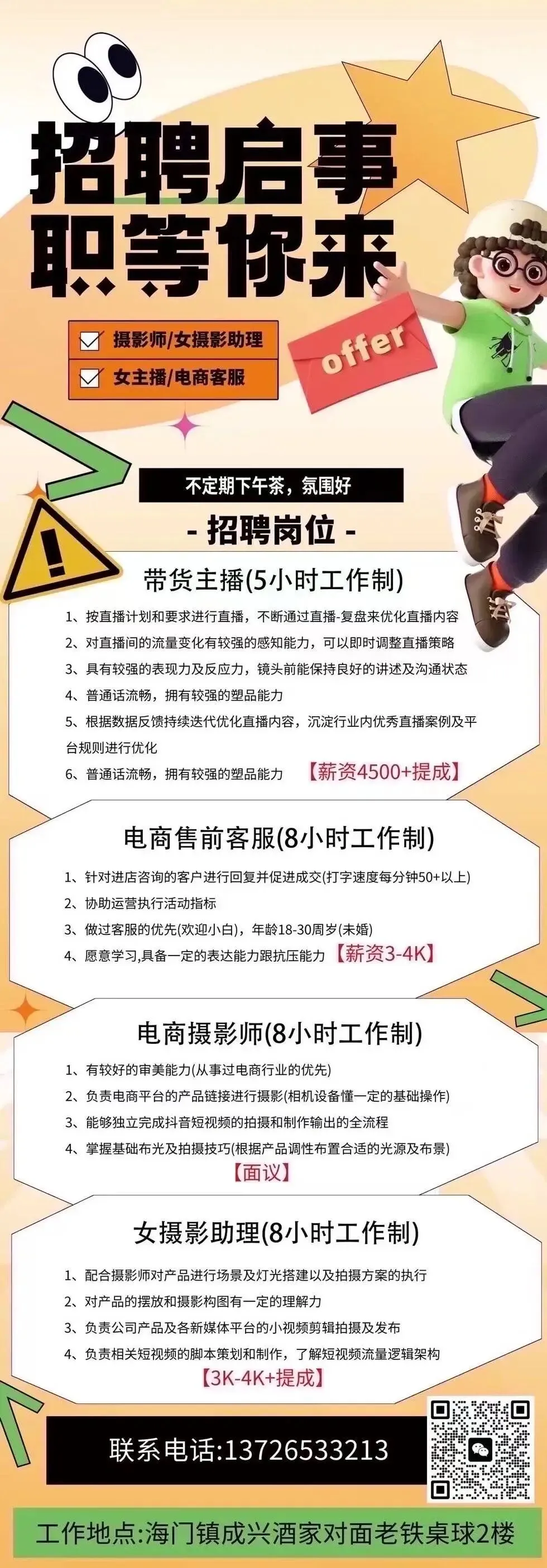 📣📣招聘、客服、摄影师,女摄影师助理以及带货女主播多名~有工作经验者优先行业:电子商务有意者请联系☎13726533213