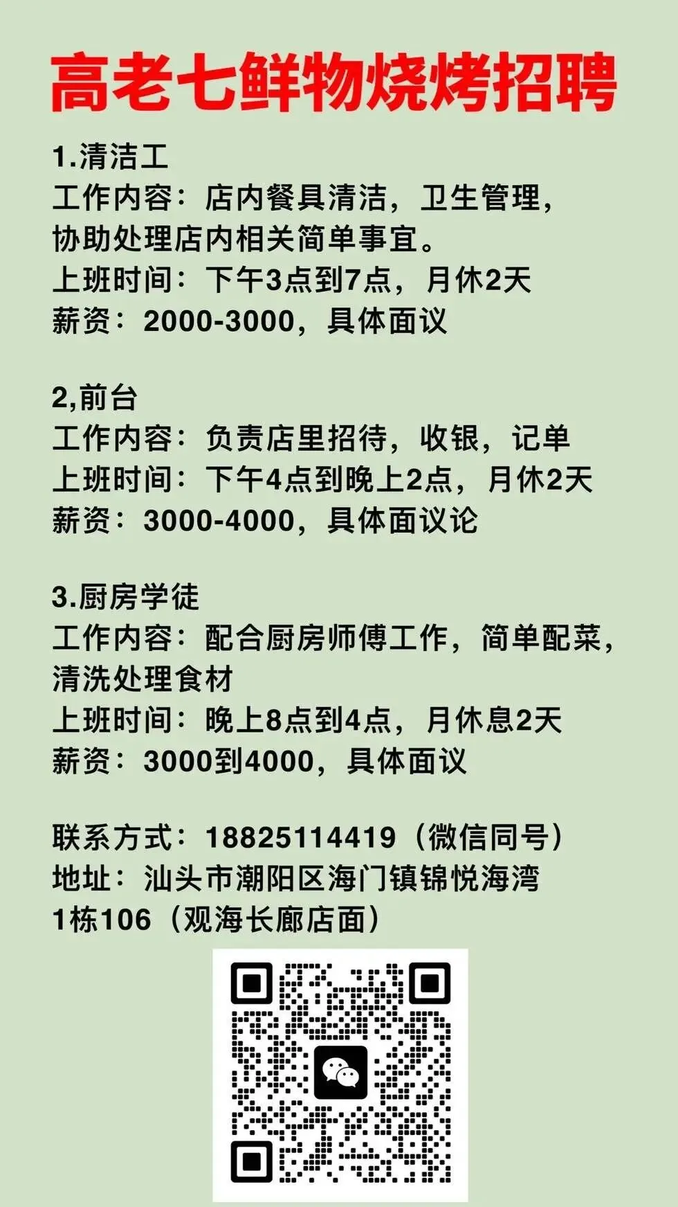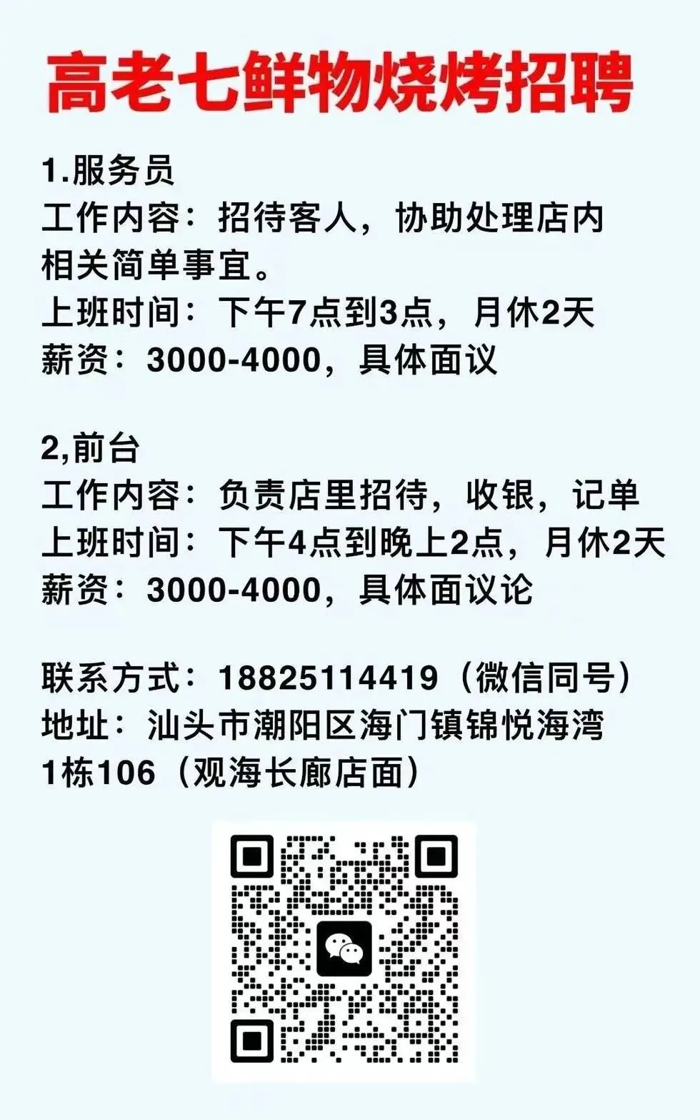 📣📣高老七鲜物烧烤店招聘联系方式☎️:18825114419(微信同号)地址🏠:汕头市潮阳区海门镇锦悦海湾1栋106(观海长廊店面)
