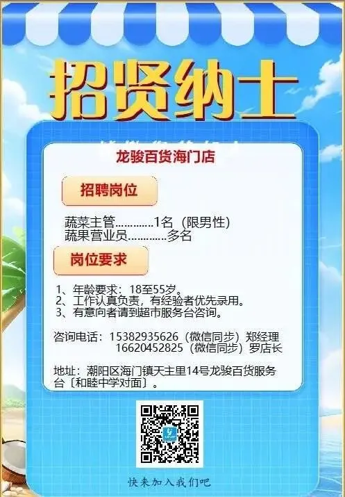 📣📣海门龙骏超市招聘,极客台球俱乐部招聘应聘地址🏠:汕头市潮阳区海门镇天主里14号龙骏百货服务台咨询(和睦中学对面)