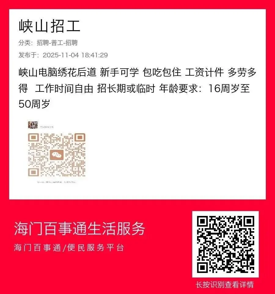 峡山电脑绣花后道招工 包吃包住 新手可学 多劳多得 工作时间自由 工资计件