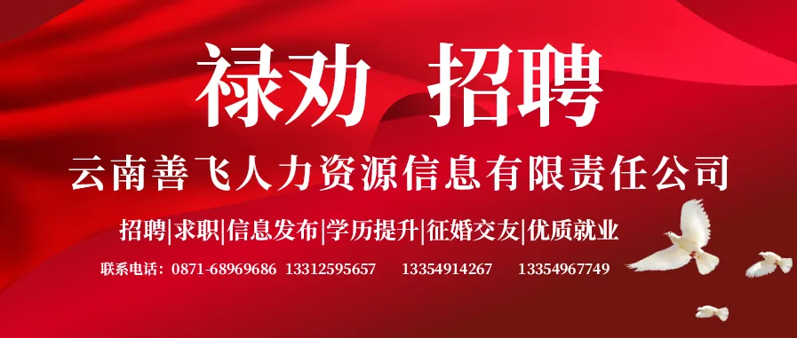 “善谋致远,飞擎未来——云南善飞,让人才与机遇精准相遇。” 投诉电话:0871-68969686 13312595657禄劝掌鸠河人才市场郑重承诺,所有岗位均提供营业执照招聘,岗位真实有效,在面试时问清楚工资及福利,再做臻选。为更好的为大家服务,部份岗位电话号码为禄劝掌鸠河人才市场工作人员电话,面试时请联系我们填写个人简历,我们将精准为你服务。