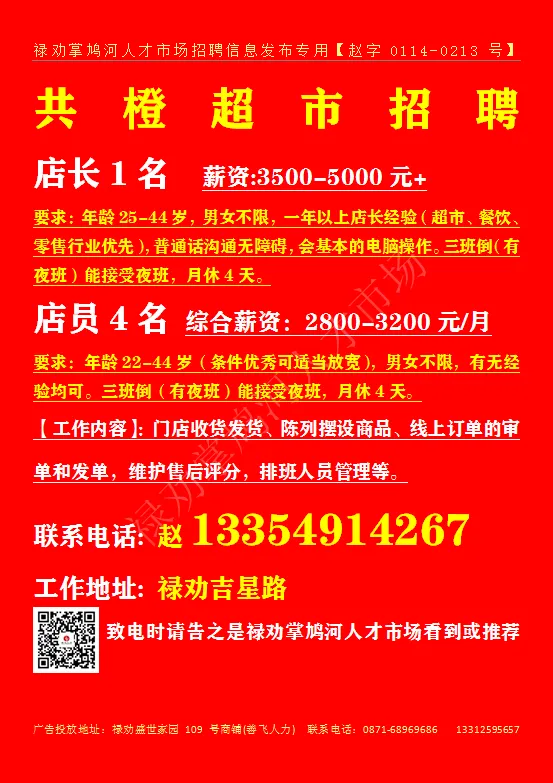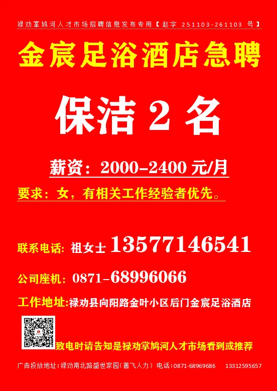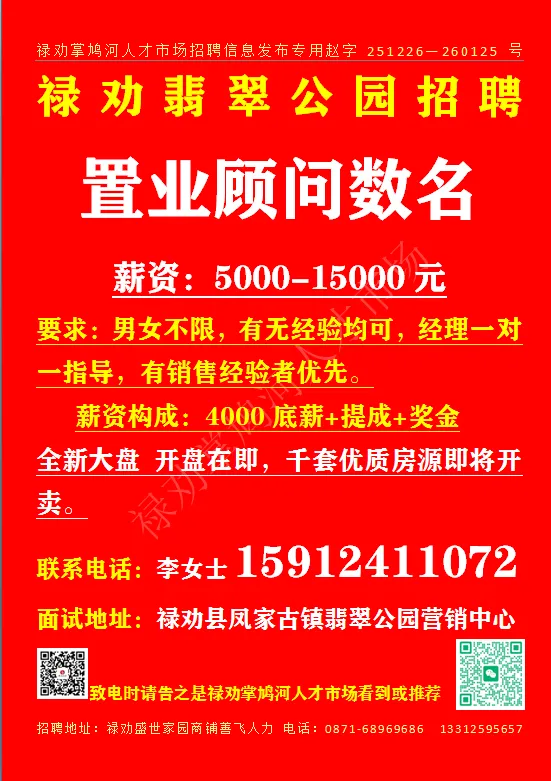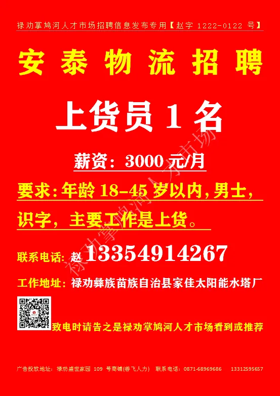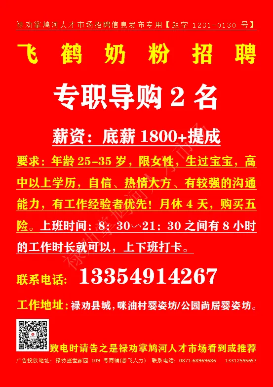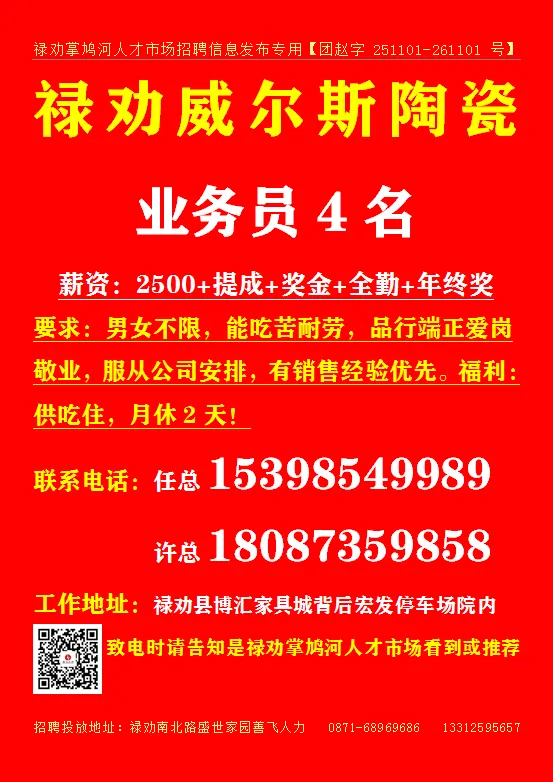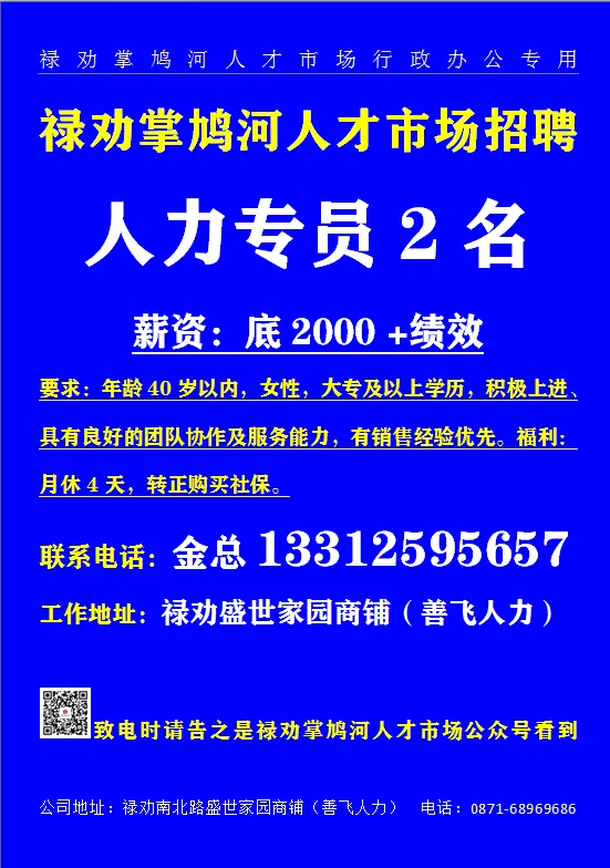 联系地址:禄劝滨河广场5栋4楼 致电时请告之是禄劝掌鸠河人才市场看到或推荐