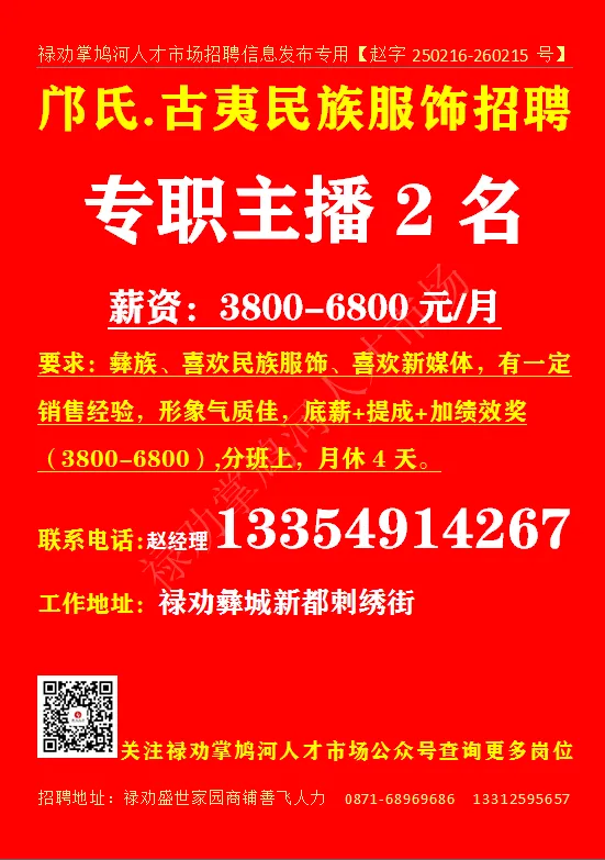 要求:彝族、喜欢民族服饰、喜欢新媒体,有一定销售经验,形象气质佳,底薪+提成+加绩效奖(3800-6800),分班上,月休4天。