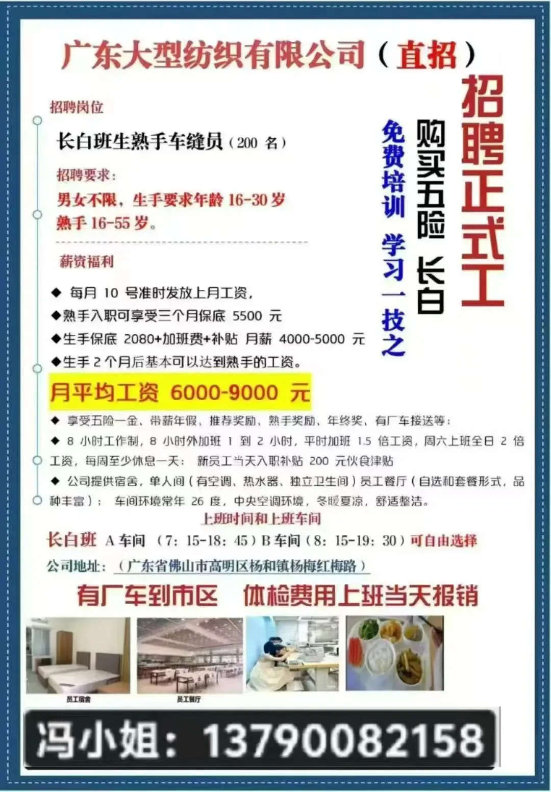 福利:包吃住(公寓6人间,空调热水器齐全,水电平摊),免体检、可借支