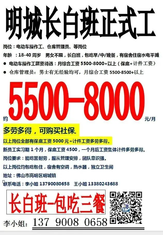 薪资待遇:月综合5500-6000元,两班倒(白班11小时/天,夜班11.5小时/天)