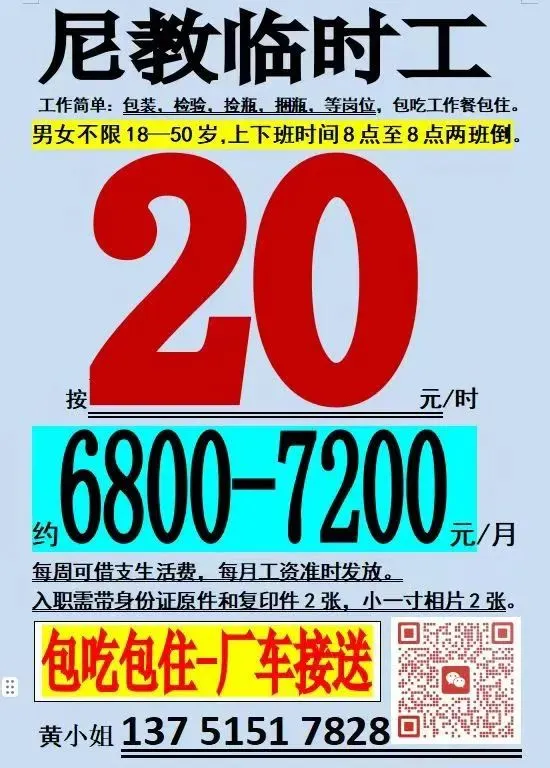 薪资待遇:20元/小时,两班倒(白班10.5小时/天,夜班11小时/天)