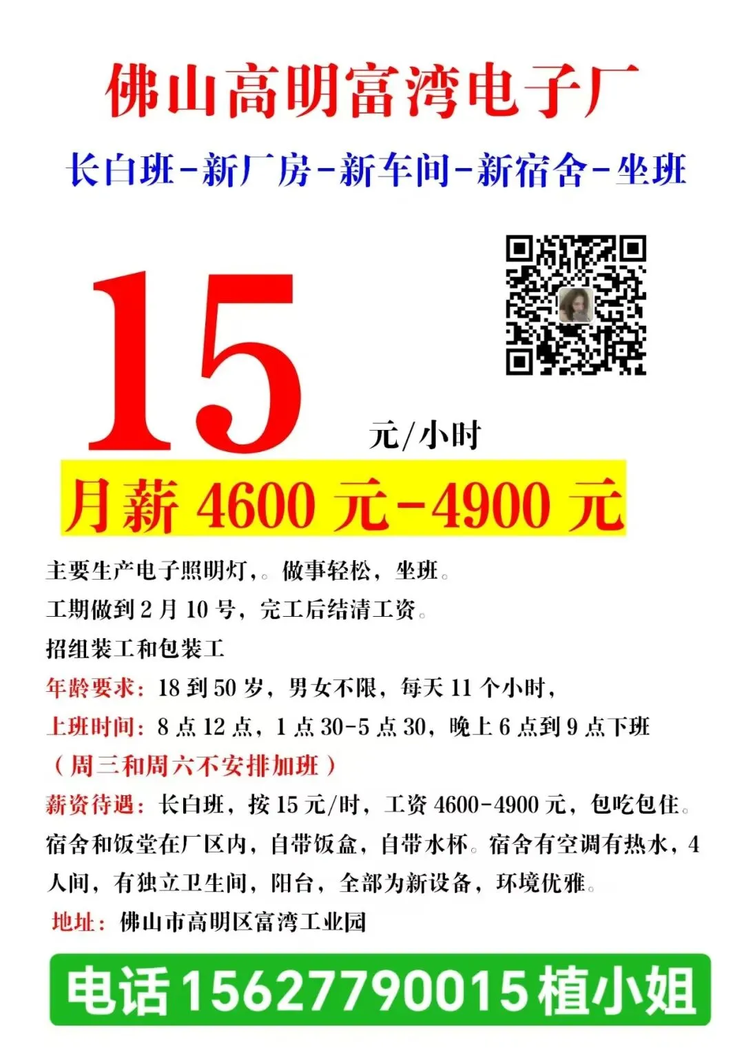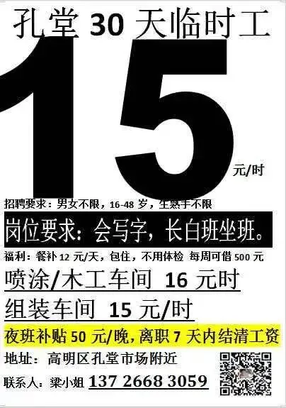 福利:包吃住(水电平摊),白班餐补30元/天,夜班餐补15元/天