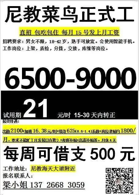 福利:包吃住(4人间,空调热水器),免体检,做满7天可借支300-500元
