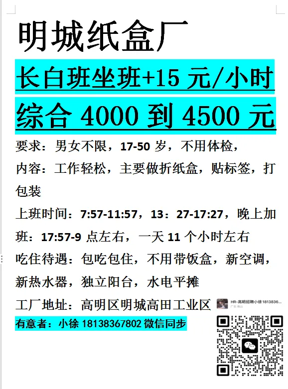 薪资待遇:17元/小时,两班倒,白班包吃两餐,夜班补贴15元/晚