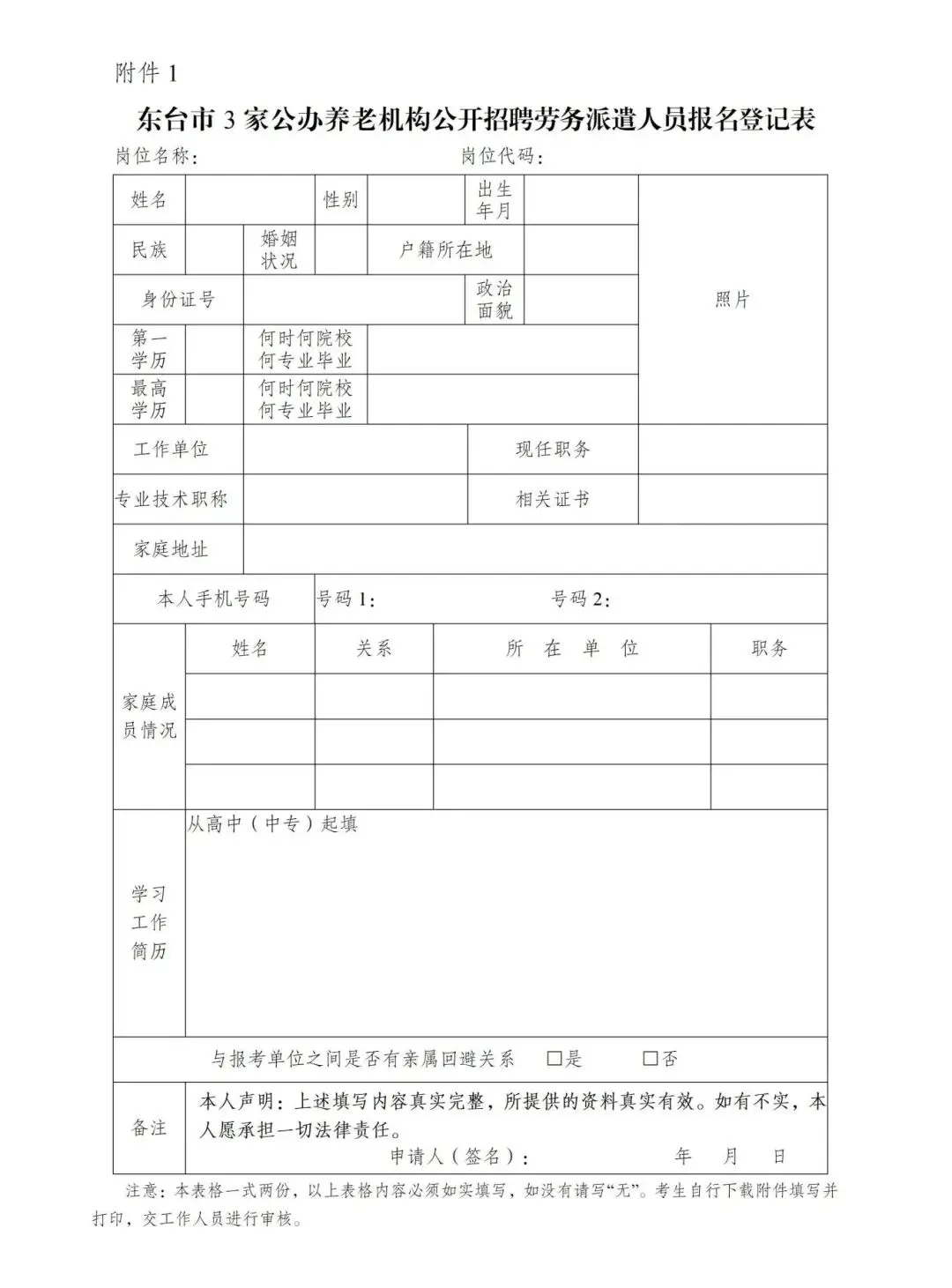 ①《东台市3家公办养老机构公开招聘劳务派遣人员报名登记表》(见附件1)一式2份;