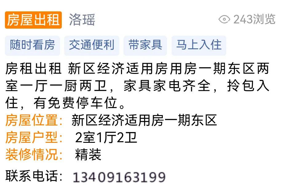 房屋出售:急售新区经济适用房,面积122平方米, 三室两厅一厨一卫,精装修带家具带家电 ,拎包入住。联系电话18098019861
