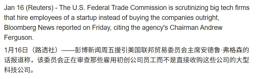 1月16日,美联邦贸易委员会(FTC)的弗格森在接受彭博电视台采访时表示该机构正在审查大型科技公司的人才收购交易,“以确保它们不是为了规避该机构的合并审查程序”。