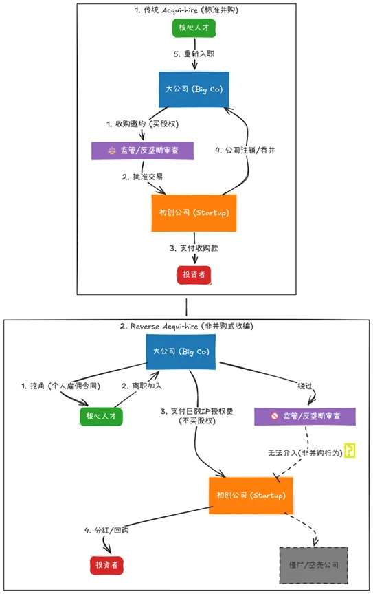 所谓人才收购交易(Reverse Acqui-hire),是美国科技巨头为了规避反垄断审查,采用人才收购(雇佣)+获得IP授权,也就是为技术和人才付费,不再收购初创公司。