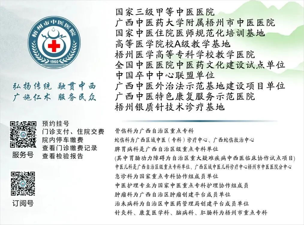 梧州市中医医院是一所集医疗、教学、科研、预防保健、康复为一体,具有中医技术门类齐全、特色鲜明的国家三级甲等中医医院,建院于1960年,是国家中医住院医师规范化培训基地、广西中医药大学附属梧州市中医医院、广西研究生联合培养基地、高等医学院校A级教学基地、广西中医外治法示范基地建设项目单位、广西中医特色康复服务示范医院、广西中医药壮药医药院内制剂孵化基地项目单位,是广州中医药大学第一附属医院医联体单位,下设有梧州市岭南中医药研究所,是梧州市中医医疗集团的牵头单位,建设有规范化发热门诊和P2+实验室。