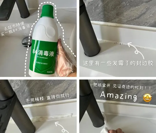 厨房、卫生间的玻璃胶发霉了,看着黄乎乎黏黏的,**请人来翻新又要收人工费,真的很烦!**其实自己用84消毒液一涂,盖上纸巾等几个小时,撕开立刻见奇迹,干净锃亮像新的一样!