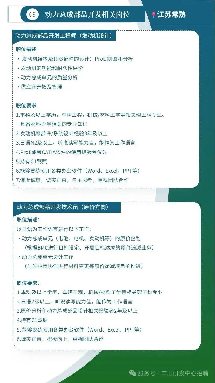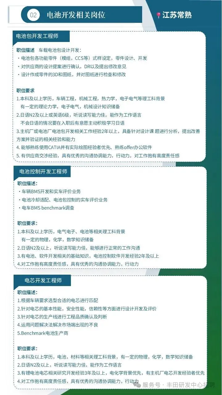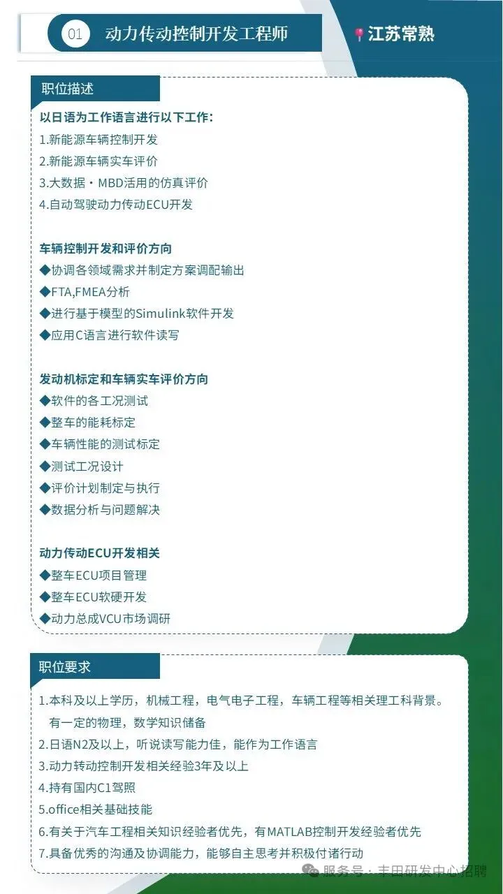 ‣ 动力传动控制开发工程师‣ 电池开发工程师(电池包/电池控制/电芯)‣ 动力总成部品开发工程师(发动机设计/原价)‣ 电动化企划开发工程师base江苏常熟or北京朝阳诚邀简历投递☞zhaopin@iem-toyota.cn
