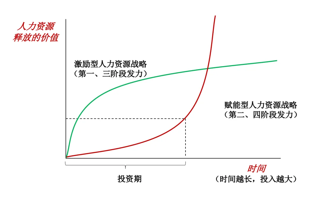 这些要求决定了其“核心人才仓”必然是高潜型人才,这类人才必须实现与企业的融合,才能产生深度创意。如果采用激励型人力资源战略,招聘一大批熟手并且绑定了大量的期权、股权、项目分红,力图立竿见影,这也是典型的不理智。换言之,企业不需要激励型人力资源战略带来的人力资源价值稳定输出,而是需要赋能型人力资源战略带来的井喷。
