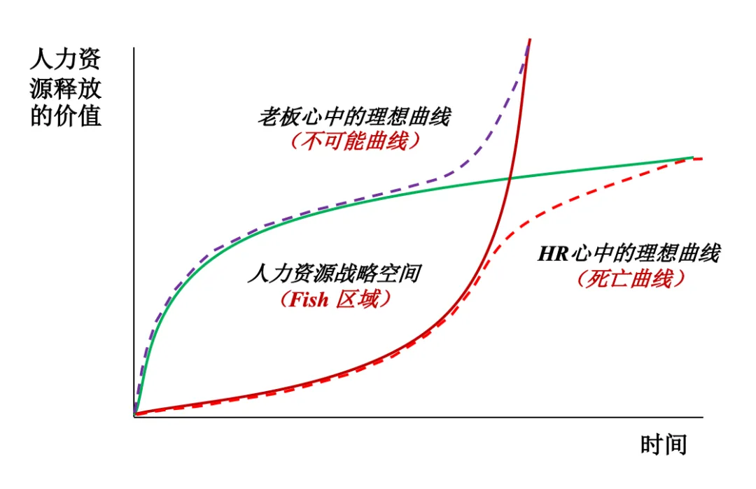 真正的人力资源战略空间是中间的“Fish区域”。在这个空间里,企业需要根据自己的业务战略(甚至其他战略)定位和人力资源结构定位,来构筑一条符合客观规律的合理曲线。曲线靠上,可能需要选择一些立竿见影的打法;曲线靠下,可以选择一些固本强基的打法。