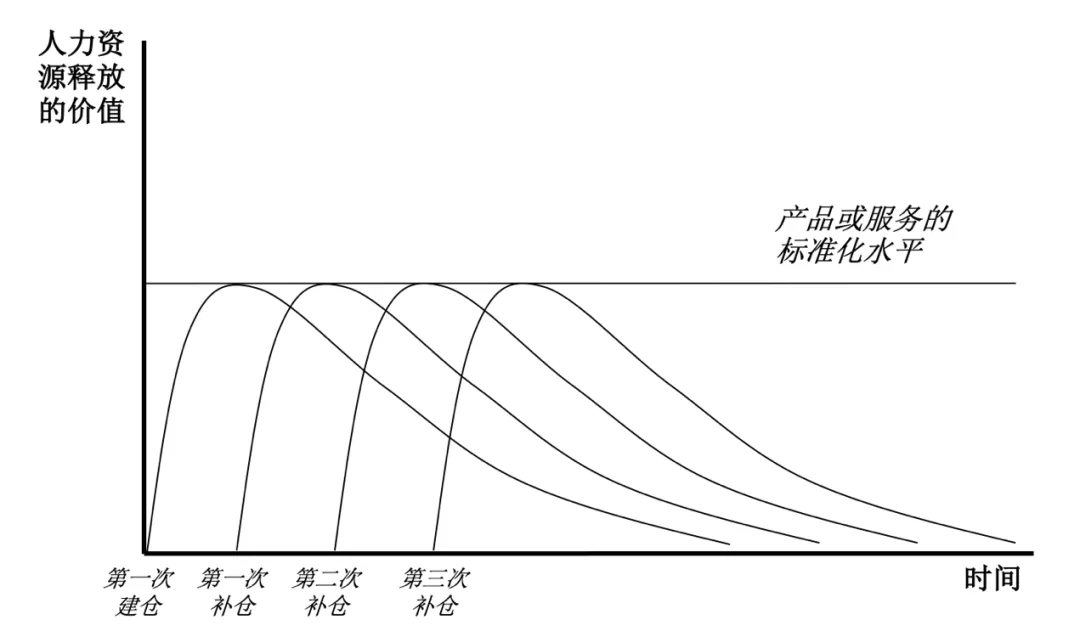 采用激励型人力资源战略的企业,企业应该根据成熟型人才的生命周期来决定建仓和补仓的节奏,确保代际更替间产品或服务的标准化水平不受影响,相对平滑(图4)。