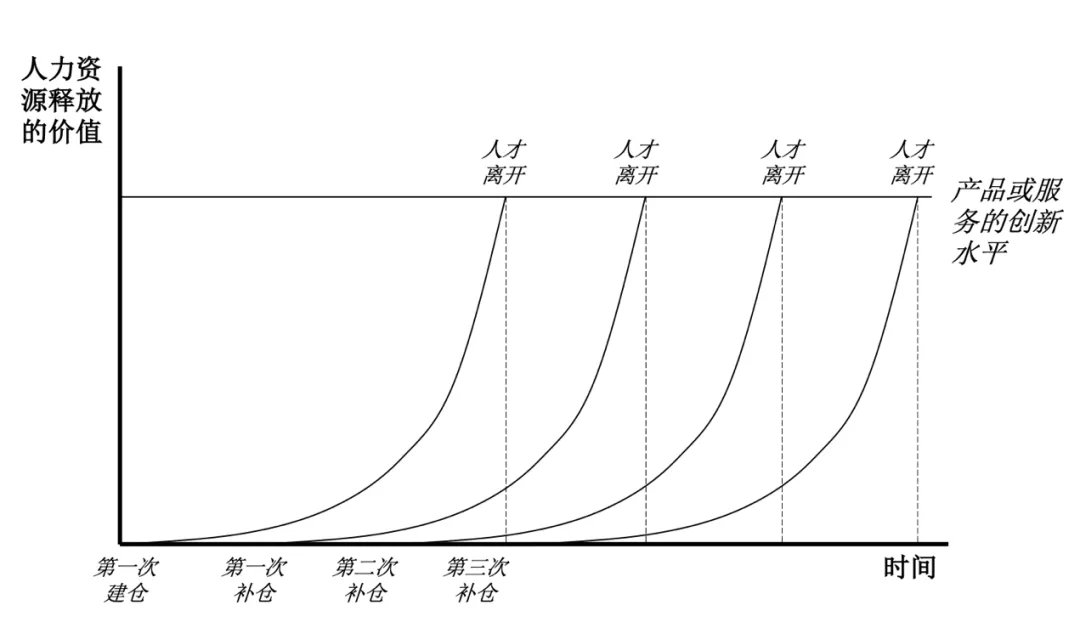 采用赋能型人力资源战略的企业,应该根据高潜型人才的生命周期来决定建仓和补仓的节奏,确保代际更替间有源源不绝的创新输出,不求平滑,但求此起彼伏(如图5)。