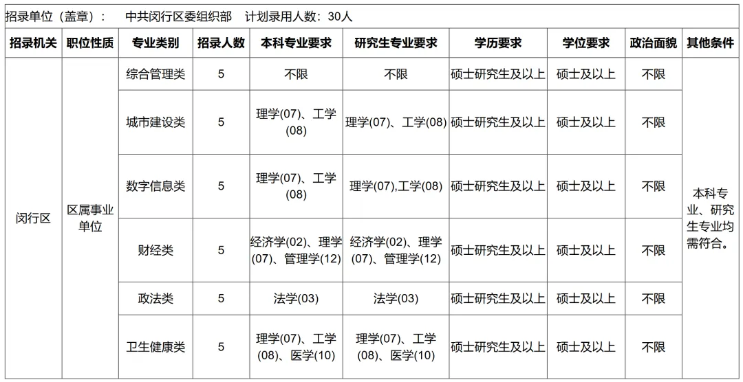 为深入贯彻落实人才强区战略,加快建设适应时代发展要求的高素质专业化干部队伍,吸引集聚一批优秀应届大学毕业生到闵行干事创业,2026年度闵行区计划招录储备人才30名。