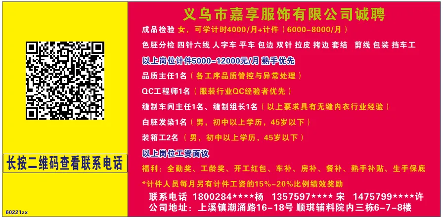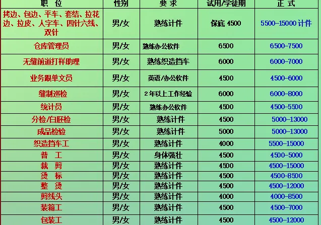 岗位一:车缝组长 1名 要求会打样、同行业管理经验5年以上,高中以上,待遇8k-12k