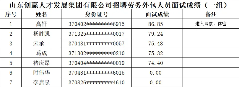 山东创赢人才发展集团有限公司招聘劳务外包人员面试工作已经结束,根据《招聘简章》规定,根据应聘人员考试总成绩,由高分到低分按1:1比例等额确定考察体检人选,若出现需要职位名额调整、人员递补的情形,将根据面试成绩依次递补。现将人员名单公布如下: