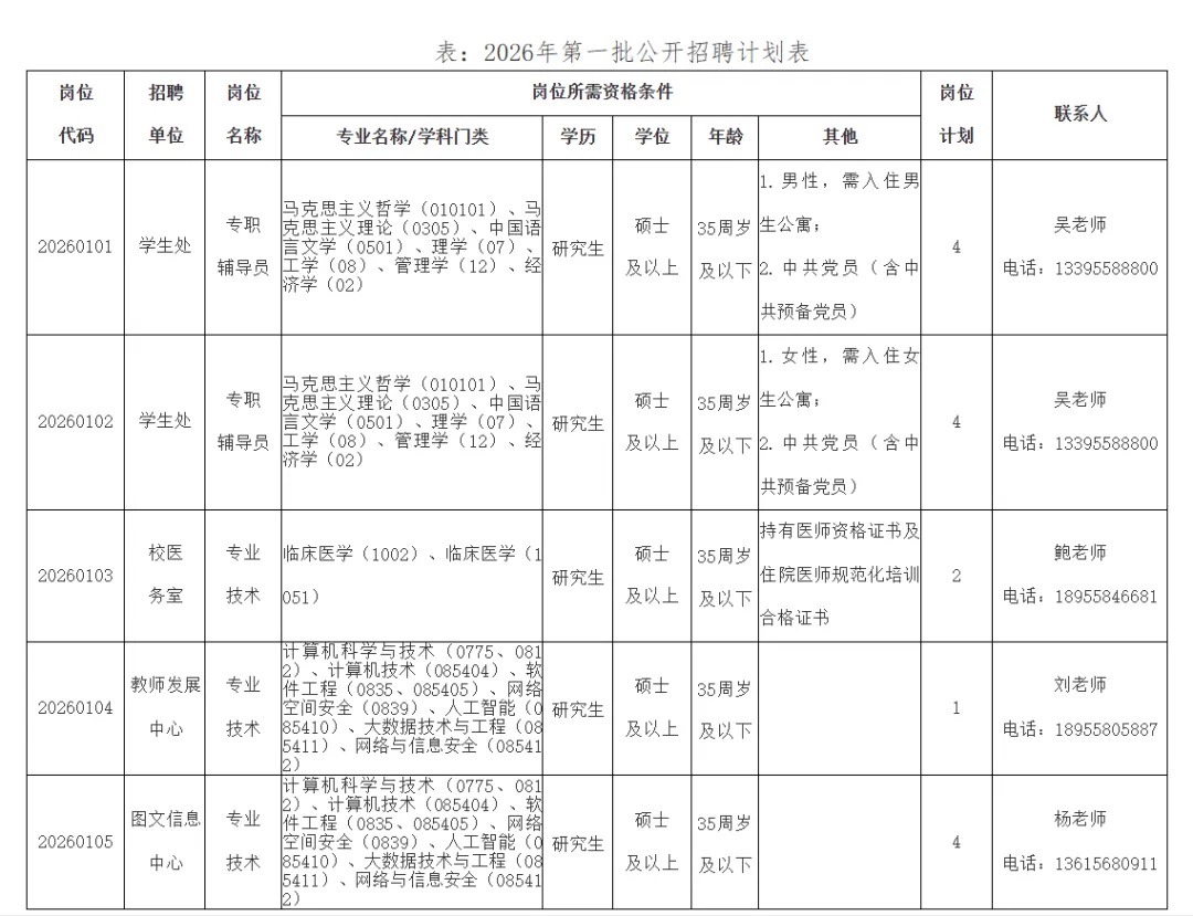 我校2026年第一批公开招聘15名专业技术人员,有关岗位要求见下表,专职辅导员主要从事学生思想政治教育工作;校医务室专业技术人员主要从事医疗服务和健康教育相关工作;教师发展中心专业技术人员主要从事教师信息化管理工作;图文信息中心专业技术人员主要从事智慧校园建设与服务等工作。所有聘用人员的最终分配部门及工作岗位安排,由学校党委研究确定,拒不服从安排的,按自动放弃聘用资格处理。