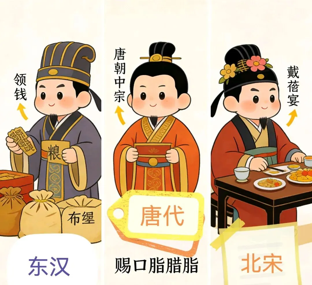东汉时期的“腊赐”制度,是在腊月(岁末)按品级发放“腊赐”,含钱、粮、布帛等,如大将军钱20万、牛肉200斤、粳米200斛。从人才管理角度,这是把年终福利制度化,明确等级标准,稳定激励官僚人才。其成本来自于财政专项支出,按品级梯度投入,保障核心官僚层。