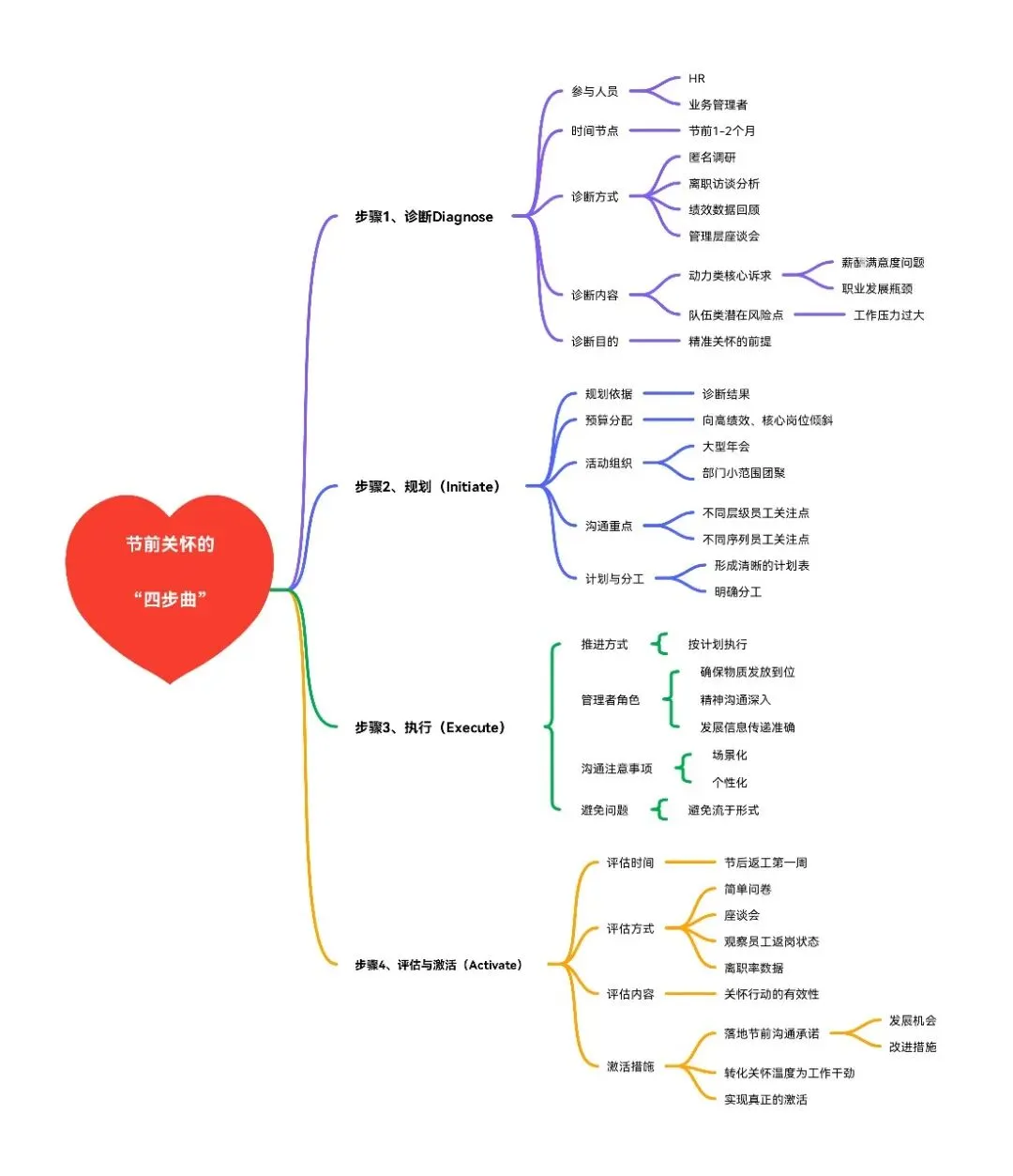步骤4、评估与激活(Activate):不要忘了,在节后返工第一周,快速进行关怀效果评估。可以通过简单的问卷、座谈会或观察员工返岗状态、离职率数据等,评估关怀行动的有效性。更重要的是,将节前沟通中承诺的发展机会、改进措施等迅速落地,将关怀的“温度”转化为节后工作的“干劲”,实现真正的“激活”。
