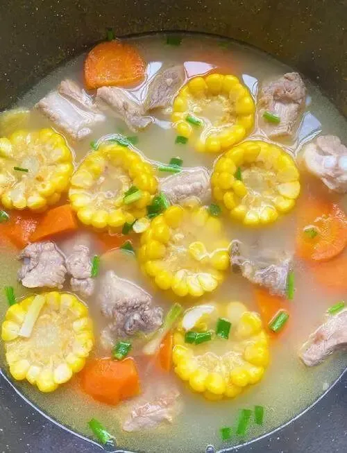 做法:猪骨冷水下锅焯水去腥。玉米切段,胡萝卜切块。所有材料一起放进砂锅,加足量清水。大火煮开后转小火慢炖1.5小时。最后加盐调味