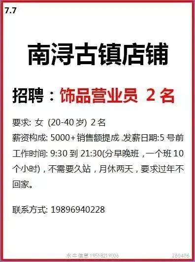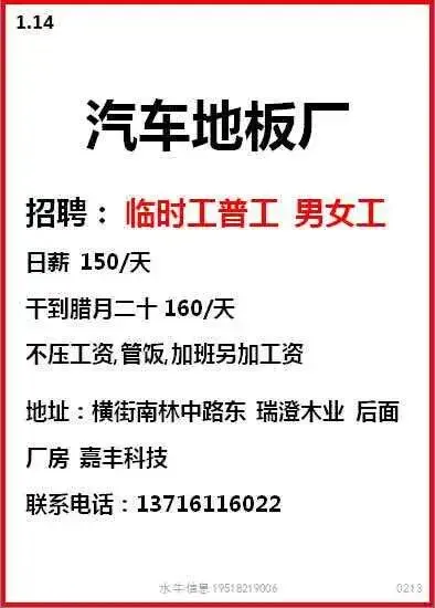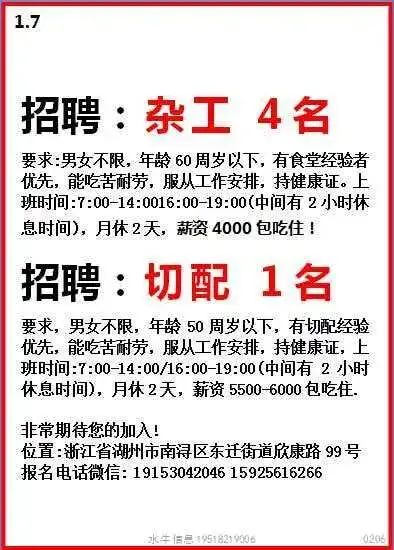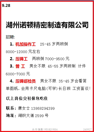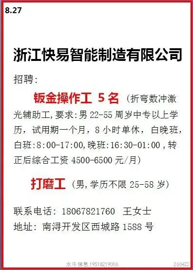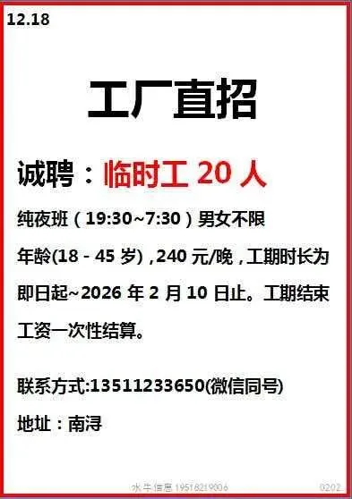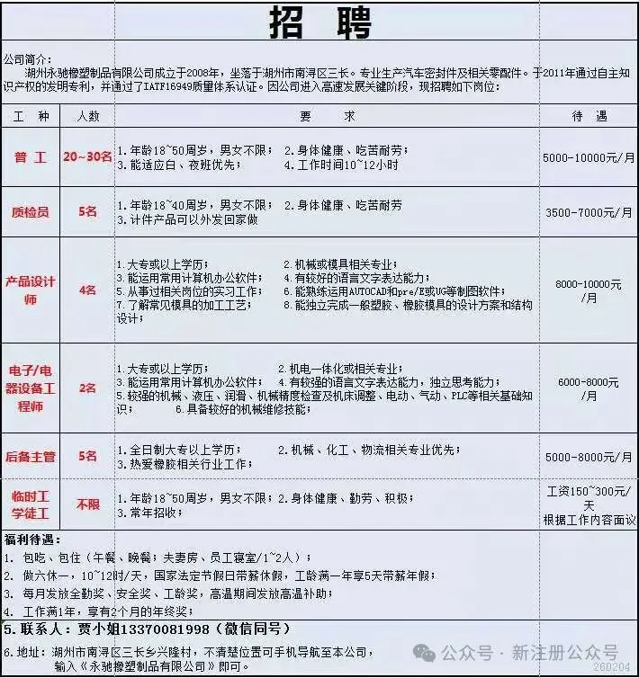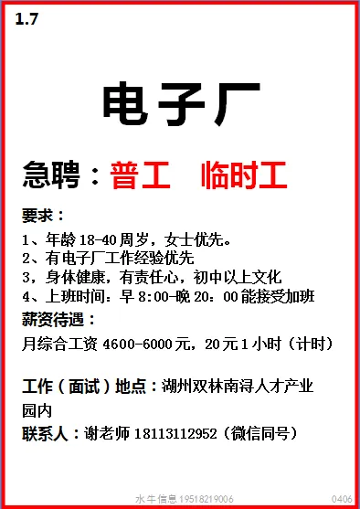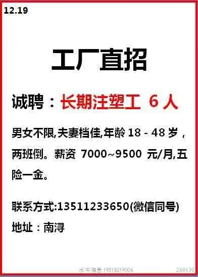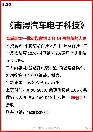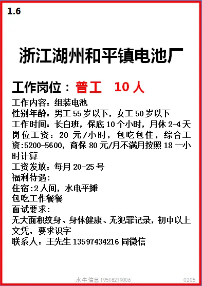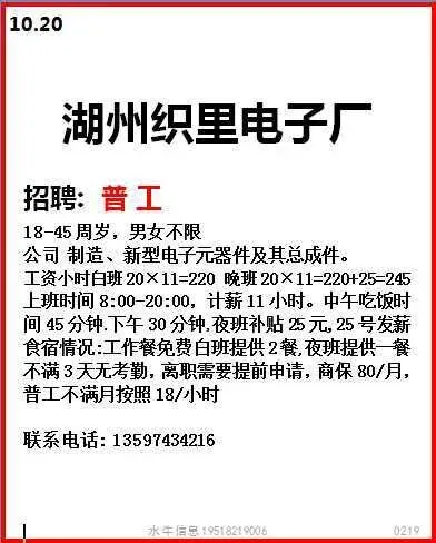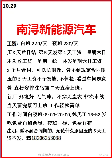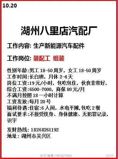 工作时间:长白班流水线岗位,7:30-17:30,加班20:30,一周加班5天,月休:2-4天。