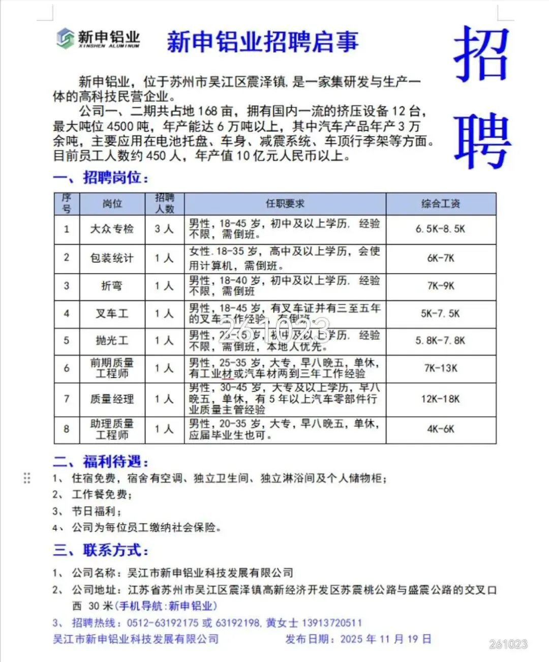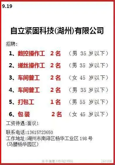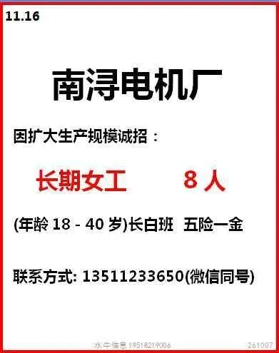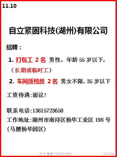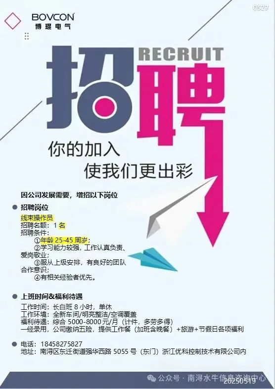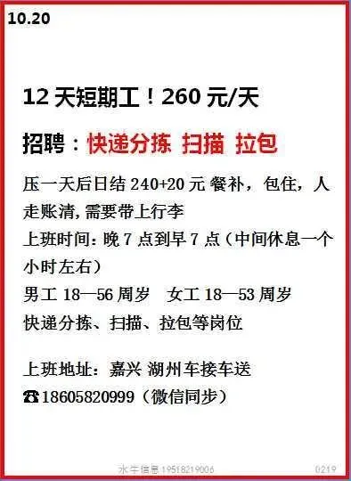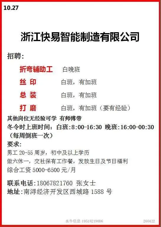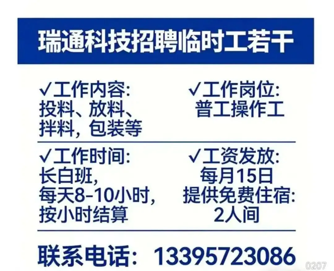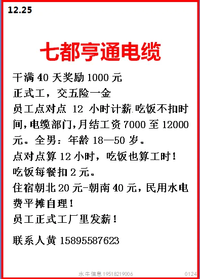 岗位:长白班流水线岗位,测试、绑扎、压接、上料有工作经验优先
