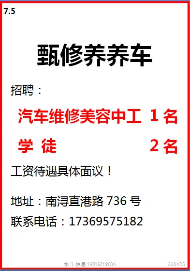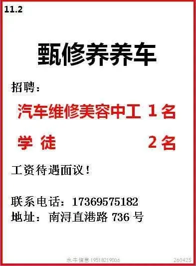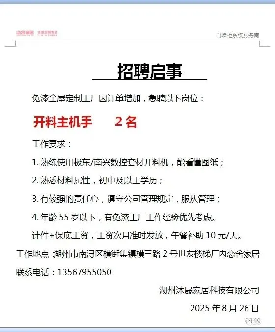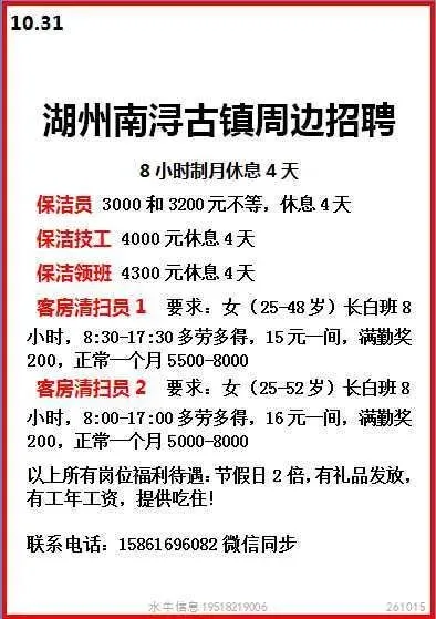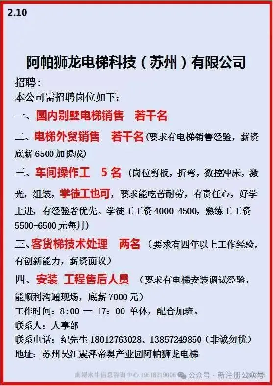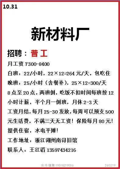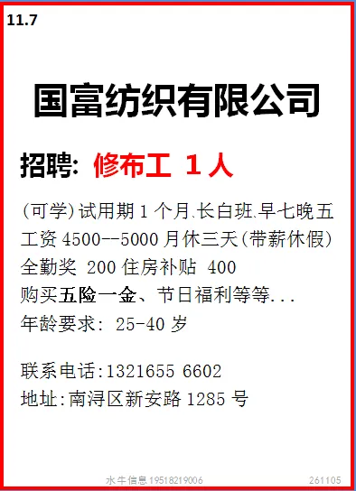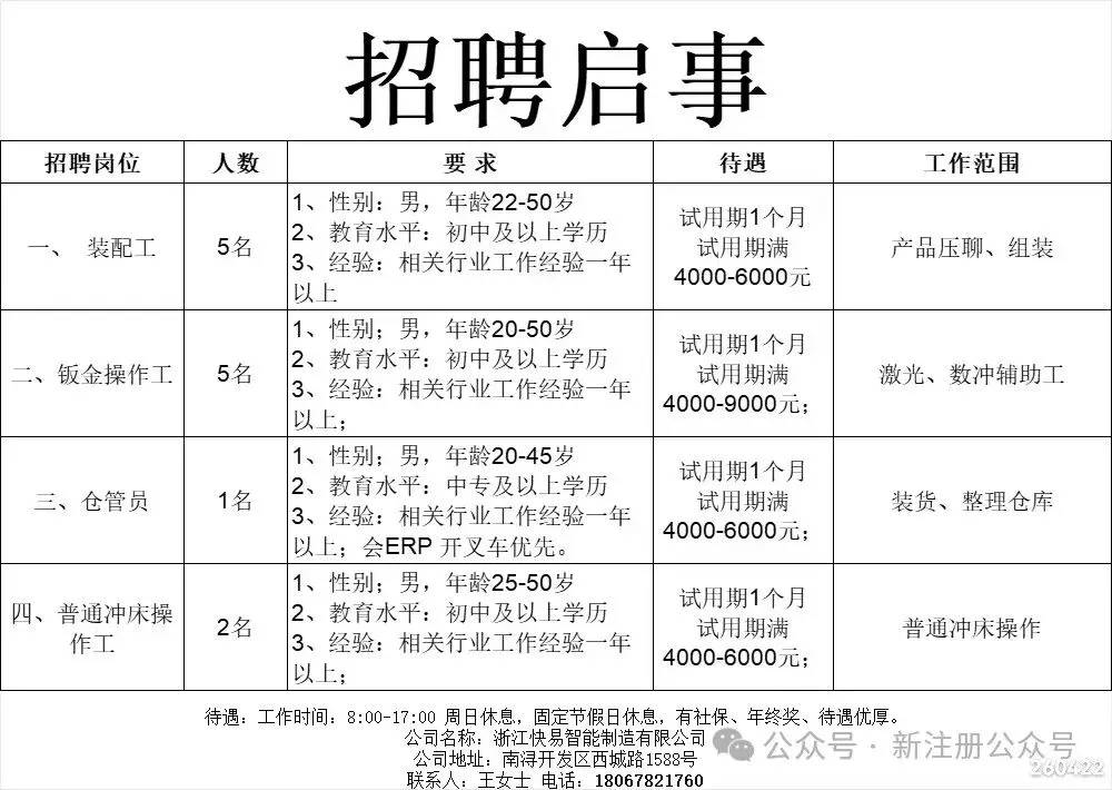 工作时间:长白班个人操作,7:00-17:00,单休