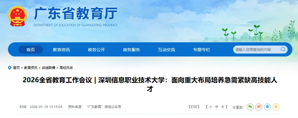 1月12日,2026年全省教育工作会议在广州召开。会上,深圳信息职业技术大学党委副书记、校长王晖围绕对接现代产业体系建设需求,加强紧缺人才培养进行交流发言。