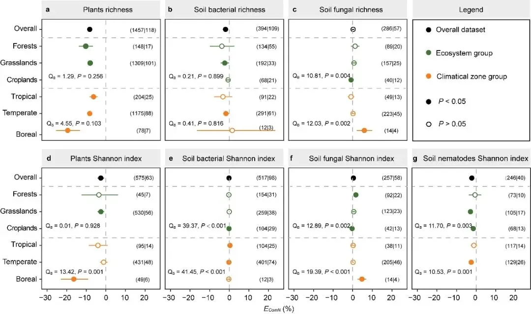 氮富集已被广泛证实会对生物多样性产生深远影响,但其在不同生态系统类型和气候背景下对植物多样性与土壤生物(包括细菌、真菌及线虫)多样性的影响是否一致,以及差异程度如何,长期以来缺乏全球尺度的系统性证据。