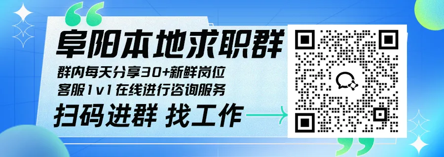 长按识别二维码,了解更多检验(月休四天/包住宿/提成)3500-7000元/月提供食宿 | 加班补助企业名称:安徽曼多服饰有限公司公司地址:安徽省阜阳市颍州区颍州区开发区创新创业工业城长按识别二维码,了解更多营业员(五险/补助)2400-3500元/月晋升空间 | 免费培训 | 年终奖 | 节日福利 | 五险企业名称:阜阳华联集团股份有限公司公司地址:清河路580号华联大厦长按识别二维码,了解更多普工技工(全勤奖)5000-7000元/月五险 | 节日福利 | 工作餐 | 全勤奖企业名称:安徽固瑞特新材料科技有限公司公司地址:阜阳经济开发区裕安路798长按识别二维码,了解更多
