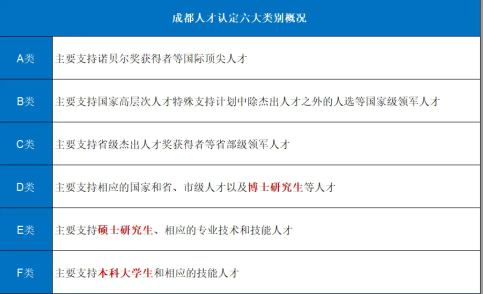 A、B、C类人才(顶尖领军层)主要面向国家级的顶尖专家、重大奖项获得者、知名企业创始人及高管、世界技能大赛获奖者等极高层次人才。因篇幅较长,具体标准可通过后文指引查询。