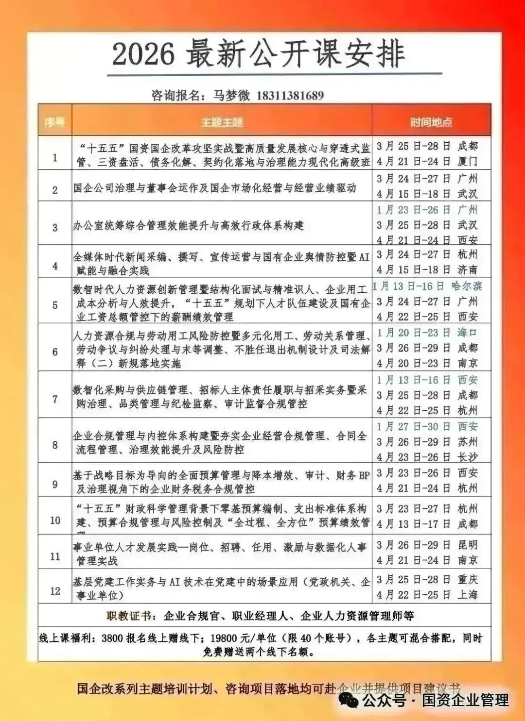 "三定"(定岗位,定编,定员)改革作为企业提升人效,实现降本/控本增效,优化治理体系的重要抓手,已纳入国企深化改革的核心任务清单。不同规模的企业在制定"三定"方案时,由于组织架构复杂程度,业务覆盖范围,管理模式等差异,在方案设计的深度,重点和操作方式上存在显著不同。为帮助国有企业在组织结构调整与"三定"改革中取得最优成效,编制一套既符合政策要求,又契合企业实际并落地实践的三定方案,应对复杂场景的实践能力,且精准把握最新政策导向与数智时代人力资源管理的变革趋势,切实破解企业当前面临的人力成本高企,人效提升乏力,人才管理难度大以及薪酬绩效体系设计不完善等重点难点问题,充分激发企业内在活力,为深化国企改革提供坚实支撑。特定于2026年3月和4月分别在广州市和西安市举办"数智时代人力资源创新管理,'三定'方案编制,人才结构优化与人才梯队建设及国企工资总额管控下薪酬绩效管理实务"研讨班。希望各单位积极组织相关人员参加。现将有关事宜通知如下: