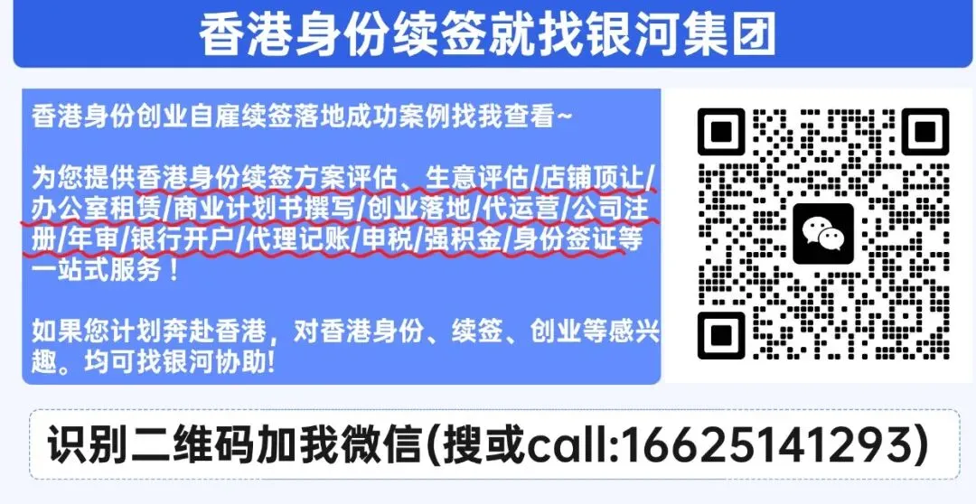 香港身份申请、续签、永居、香港创业、公司注册、真实独立地址、年审报税、缴纳强积金、变更信息、银行开户、香港教育、孩子插班等就找银河,只专注香港。国内top品牌,和港府深度合作!大公司有保障。联系我(微信and电话16625141293)安排专业规划老师一对一服务
