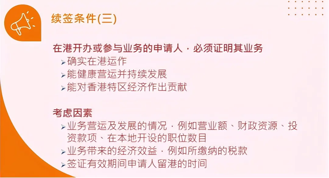 申请人须证明业务确实在港运作、健康营运并持续发展,能对香港经济作出贡献,审批考虑业务营运及发展情况、财政资源、本地职位数目、经济效益及留港时限等。
