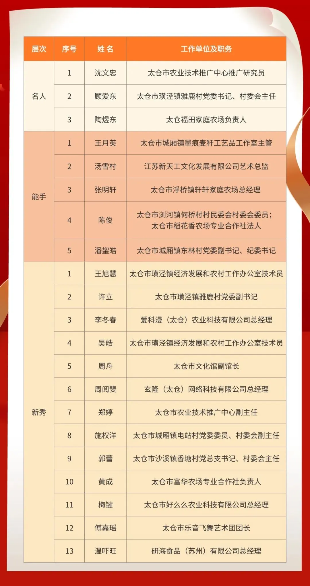 近日,第三批乡土人才“三带”培养对象名单已公布,我市新增21名培养对象,其中3名“三带”名人、5名“三带”能手以及13名“三带”新秀。