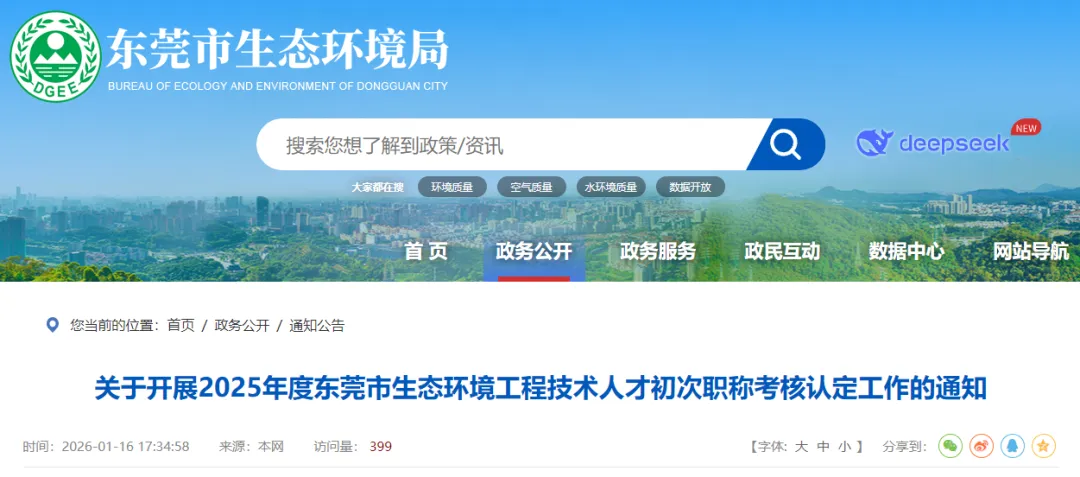近日,东莞市生态环境局发布《关于开展2025年度东莞市生态环境工程技术人才初次职称考核认定工作的通知》,一起来看看!