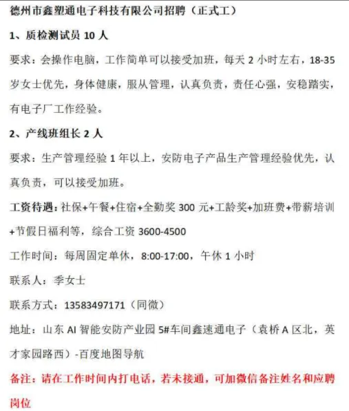食宿:免费提供两餐,免费提供女工宿舍,独立卫浴,热水器齐全!