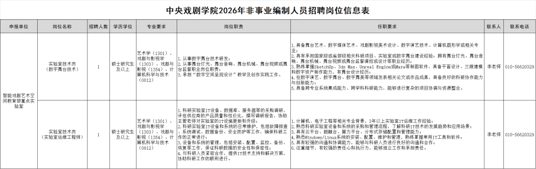 (二)智能戏剧艺术空间教育部重点实验室技术岗(实验室运维工程师)。
